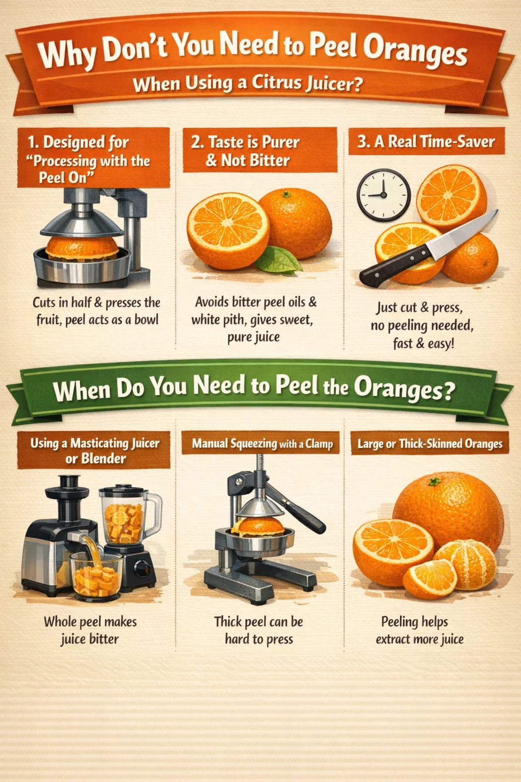 De buitenste laag van de sinaasappelschil bevat veel olieklieren, waar de sterke etherische oliegeur vandaan komt. Als je de sinaasappel schilt en vervolgens in een gewone sapcentrifuge doet, wordt het witte membraan tussen de schil en het vruchtvlees (de belangrijkste bron van bitterheid) verpletterd. Bij gebruik van een citruspers is de druk van binnen naar buiten, waardoor alleen het vruchtvlees en het sap in contact komen, waardoor wordt voorkomen dat de bittere schilolie en het witte merg eruit worden geperst. Dit resulteert in een zoet, puur smakend sap.
